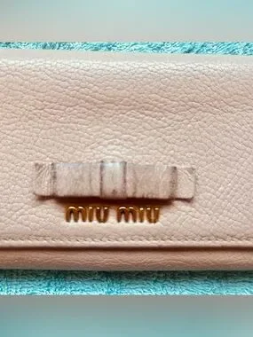 A classic and coveted Miu Miu piece featuring the iconic sculpted leather bow (Fiocco) on the front flap with signature gold-tone logo lettering. Crafted from luxurious pebbled Madras leather in a timeless blush pink. This is the full-size continental/bifold style — roomier than the trifold, perfect for everyday use.