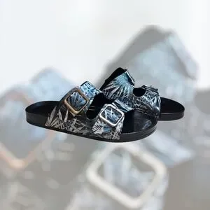 Stylish sandals with a tropical leaf print. Features adjustable buckles for a perfect fit. Ideal for casual outings.