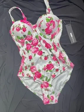 Fashion Nova White Floral One-Piece Swimsuit with Pink Roses SOLD OUT on FN!