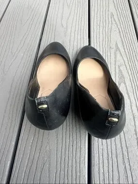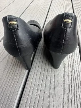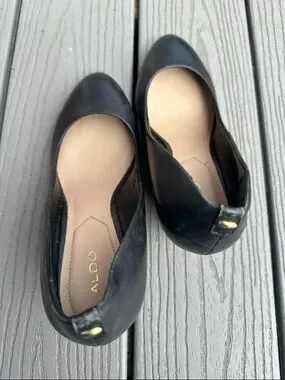 Sleek black leather wedge by ALDO. Classic round toe with a smooth upper. Cushioned insole for comfort. Timeless style for work or events. Fair condition- some signs of wear on back and sides of wedge.