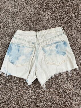Bleached white denim shorts with subtle blue tie-dye accents. Features a high-rise fit, frayed hem, and distressed details for a casual, on-trend look. Soft, breathable cotton blend for all-day comfort. Pairs easily with tees and sandals for summer styling.