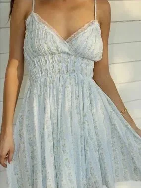 Light blue floral mini dress with delicate lace trim and adjustable spaghetti straps. Smocked waist provides a fitted, flattering shape and a soft, flowing skirt. Breathable fabric keeps you comfortable for daytime outings and warm-weather events.