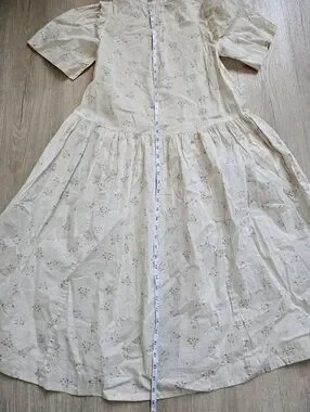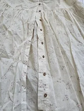 Pen mark on sleeve dress. Dress is sheer Soft light floral midi dress with a relaxed, feminine silhouette. Button-front design for easy wear and subtle ruffle details at the shoulders. Lightweight fabric and short sleeves keep the look breezy and comfortable. Perfect for everyday wear and casual outings.