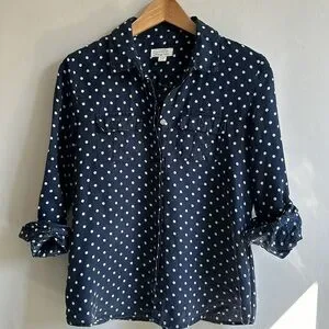 100% Linen navy & white polka dot button down shirt women’s medium petite