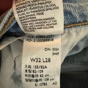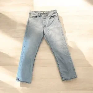 Classic straight leg jeans with a light blue wash. Five-pocket design and belt loops. Subtle fading for a lived-in look. Versatile style for everyday wear.