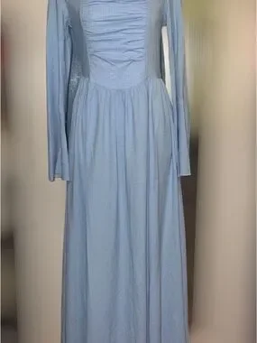 A refined light blue maxi dress with a square neckline and fitted ruched bodice. Soft long sleeves and a flowing skirt create graceful movement. Perfect for formal events or special occasions. Available in light blue.