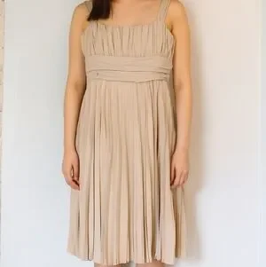Anne Klein Dress Fit Flare Baby Doll Midi Size 12P Beige Pleated Lined Summer