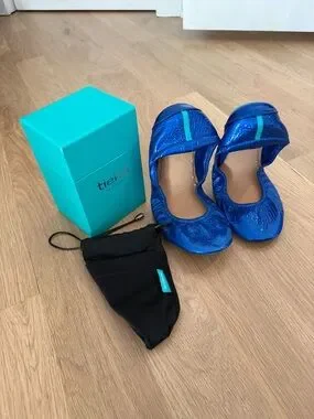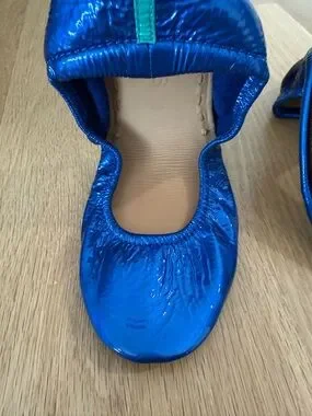Tieks ballet flats in sapphire blue patent leather. Soft cushioned insole for comfort. Elastic topline for secure fit. Iconic Tieks split sole for flexibility. Worn once.