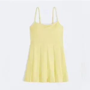 Brighten up your wardrobe with this adorable Abercrombie & Fitch pleated tennis dress in a sunny yellow hue. Features adjustable spaghetti straps, built-in shorts with pockets, and a flattering pleated skirt design. Perfect for on and off the court, casual outings, or a sporty-chic look.