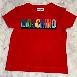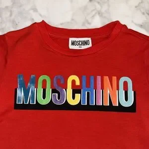 Vibrant red tee with a bold multicolor Moschino logo. Perfect for fun and style.
