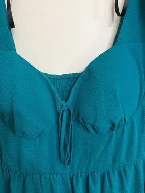 Flirty mini dress in a rich teal color. Features puff sleeves and a tiered skirt. Sweetheart neckline with a front tie. Lightweight textured fabric. Easy, feminine silhouette.