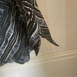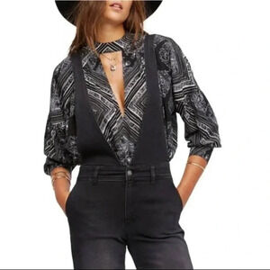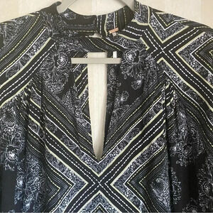 Free People tunic size small. Black, white and yellow printed long sleeve tunic top. High neck with a v-neck and open back. Back neck piece has buttons. Excellent condition. Smoke free home.