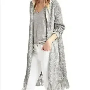GAP Longline Boho Fringe Open Front Heather Gray Cardigan Sweater