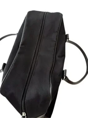 Sleek black bag designed for everyday travel, carry on or gym use. Durable canvas and faux leather fabric with a smooth top zipper for secure access. Inside pocket. Comfortable secure stiff black handles and reinforced seams and rings for reliable carry. Clean, minimalist style that complements any outfit.
