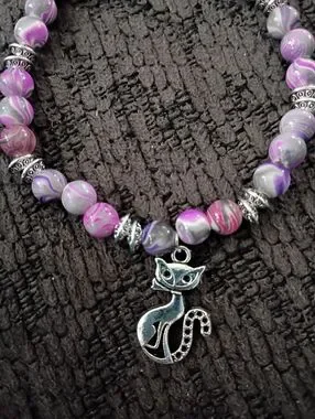 Purple Acrylic Light Weight Round Beaded Bracelet Stretch Elastic With Cat Charm