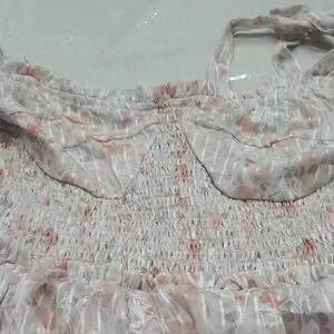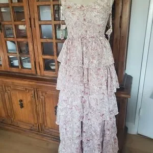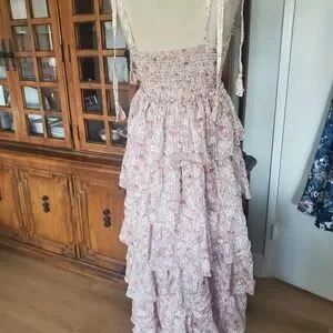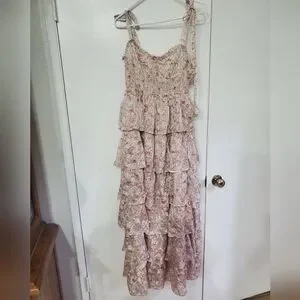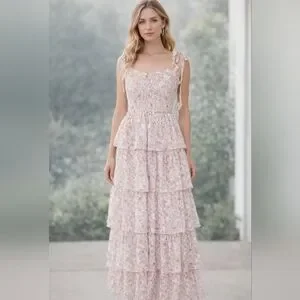 Elegant pink dress with floral pattern. Features tiered layers and delicate straps. Perfect for special occasions.
