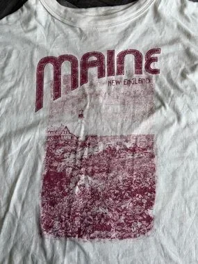 Classic white graphic tee featuring a faded red "Maine" and scenic print. Soft cotton look. Casual, vintage-inspired style. Easy to pair with jeans or shorts.