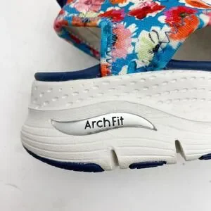 Skechers Arch Fit sandals provide exceptional support with a podiatrist-certified arch support system. These comfortable slide-on sandals feature a vibrant multi-color floral textile upper over a navy blue footbed and a thick, cushioned white midsole. Designed with a flexible traction outsole and a pull tab for easy entry, they offer a secure fit with a slingback-style strap. The breathable fabric and contoured footbed make them ideal for all-day wear during the warmer months.