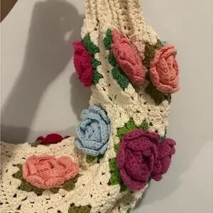 This stunning handmade crochet cardigan is a true statement piece, crafted with care by a skilled artisan. Featuring vibrant 3D rose appliqués in multiple colors, each flower is meticulously crocheted and stitched onto classic cream granny squares. The cardigan is chunky, warm, and beautifully heavy, making it perfect for cooler days or as a unique layering piece year-round.