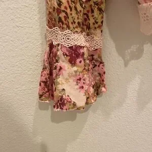But down in the front, cute flare sleeves lace on the bodysuit area. Bottom area is stretchy, but the top floral part is not stretchy at all.