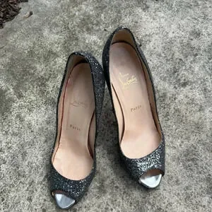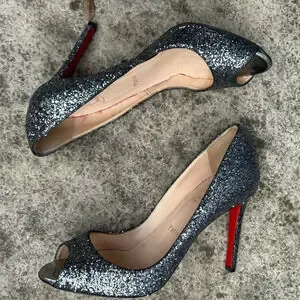Christian Louboutin Metallic Grey Glitter Very Prive Peep Toe Pumps, Size 38.5
