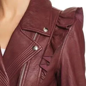Paige "Annika" moto jacket in embossed lamb leather. Notched collar; zip front with trapunto-stitching. Ruffled frills on shoulders. Long sleeves; zip cuffs. Two zip pockets. Coin flap detail. Semi-fitted