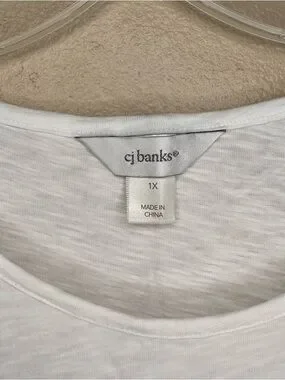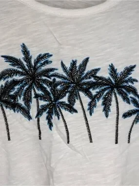 CJ Banks White Scoop Neck Slub Knit Top Embroidered Palm Trees