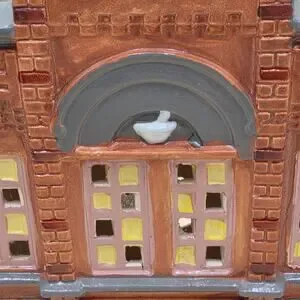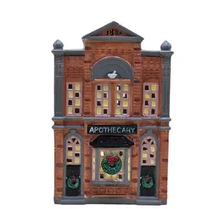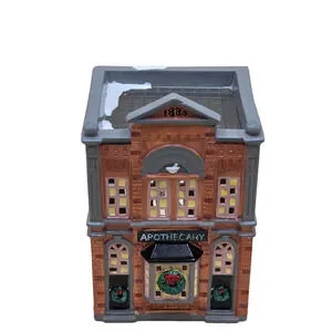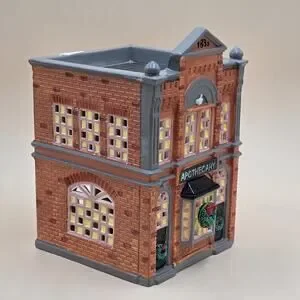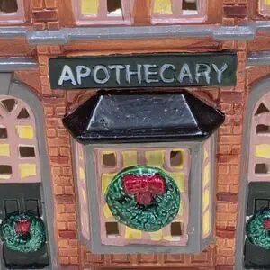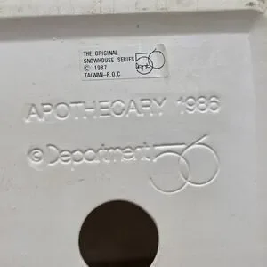 Christmas village Building from 1986. This American-style, hand-painted ceramic and porcelain house features a snow-covered apothecary building with multicolor detailing, illuminated lights, and a high gloss finish. Suitable for furniture placement in any room, this collectible from Department 56's Snow Village collection captures the essence of seasonal villages from the late 20th century, making it a charming addition to any holiday decor.