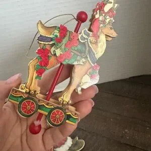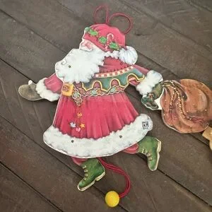 Vintage Wooden Mary Engelbreit Pull String Santa with sack and 3D Deer