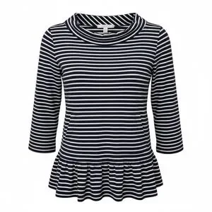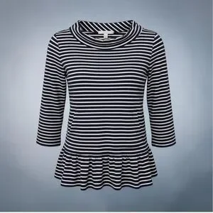 Keywords: striped top, nautical stripe 3/4 sleeve, ruffle hem, elevated basic, polished casual top, tunic top, striped knit top, blue and white, womens top, striped blouse, knit blouse, casual blouse
