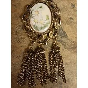 This Goldtone Hand Painted Flower Tassel Brooch Pin is a unique and elegant piece of vintage jewelry for women. The brooch features a delicate flower shape with intricate hand-painted details, giving it a heartfelt and charming appeal. Perfect for a birthday occasion or to add a touch of nature-inspired style to any outfit, this original piece captures the essence of flowers and plants with its beautiful design. Made from porcelain and with no stone embellishments, this brooch exudes a timeless charm and is sure to be a cherished accessory for any jewelry collection.