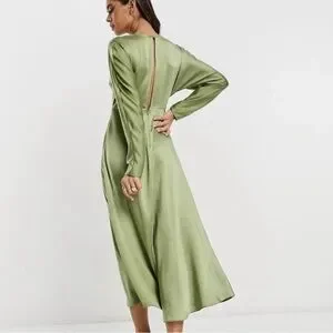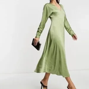 Elegant ASOS midi dress in a soft olive green. V-neckline with long sleeves. Flowy skirt with subtle drape. Minimal, modern silhouette. Easy to dress up or down.
