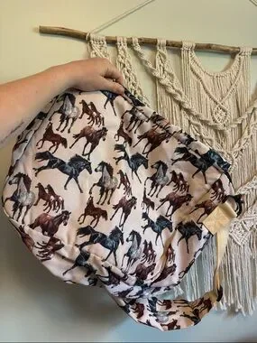 Light cream crossbody bag with an allover horse print. Multiple brown and black horses add a western feel. Adjustable strap in matching print. Lightweight and eye-catching. Large tote bag.