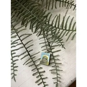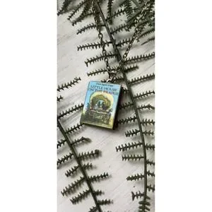 This is a handcrafted necklace featuring a charm locket with a book-shaped pendant. The pendant is inspired by the TV show "Little House on the Prairie" and celebrates its 50th anniversary. The necklace has an adjustable length of 20 inches and a hook closure. The multicolor pendant is designed with an inspirational theme and is made in the United States. The chain type is book-shaped.