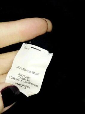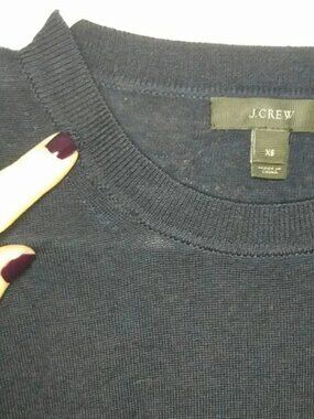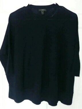 100% Merino wool sweater in black with batwing 3/4 sleeves. The stitching is coming undone in a spot on the collar- not noticeable but pictured.