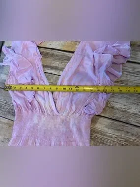 Flowing maxi dress with a deep V-neck and flutter sleeves. Smocked waist for a flattering fit. Lightweight fabric drapes beautifully. Soft ombre from lavender to periwinkle.