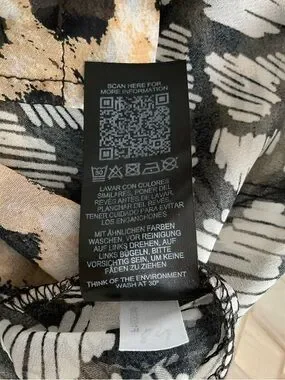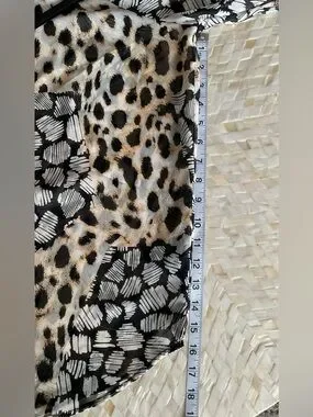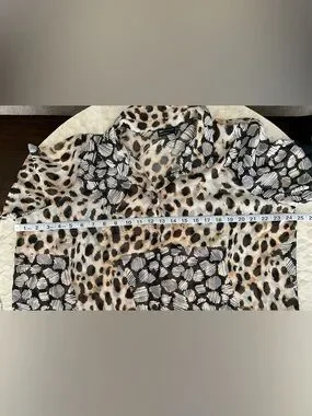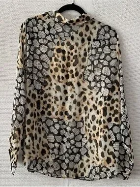 Semi-sheer button-front blouse. Mixed leopard and graphic print panels. Long sleeves with button cuffs. Lightweight flowy fabric. Versatile for day or evening wear.