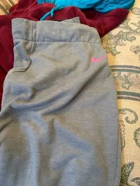 Nike straight leg pants. Gray fabric with bold pink "JUST DO IT" logo down the leg. Soft knit material. Side pockets. Casual athletic style.