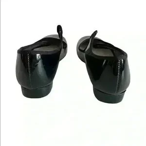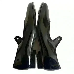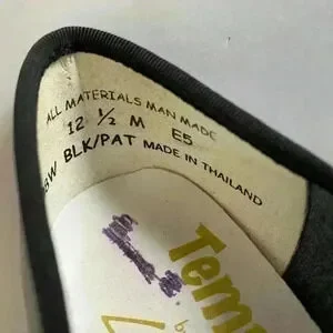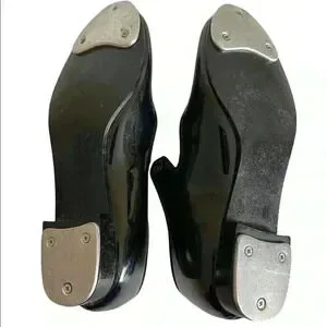 Tempo by Leo’s tap shoe. Black patent leather. All man made material. Size: 12 1/2. Some scuffs on the outside. Scuffs will not show onstage. Previous students name crossed off insole. Use with a normal shoe string to tighten or add a ribbon for dramatic effects. Ribbon not included. Shown only for a suggestion.