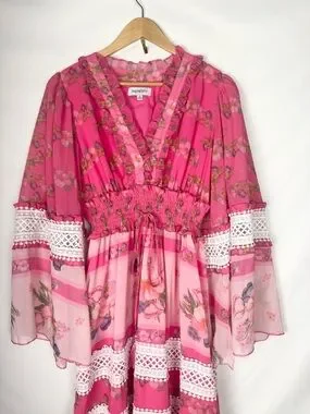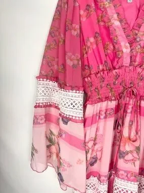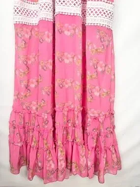 Whimsical Faeriesty Pink Floral Boho Style Maxi Dress with Lace Trim Size M