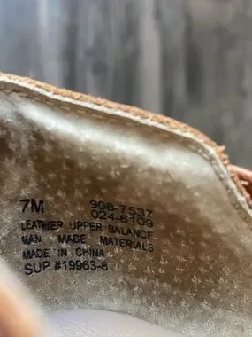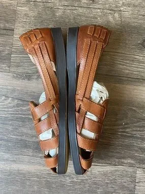 Woven leather upper with open weave design. Cushioned footbed for comfort. Slip-on style for easy wear. Flexible rubber outsole for traction.