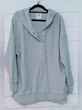 Relaxed ribbed henley pullover in a light sage green. Button-front neckline and soft, slouchy fit. Easy, casual staple for layering. This is so cozy and comfortable it feels like a good 🤗 🫂 hug, it will definitely be a favorite in your closet.