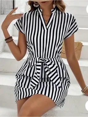 Chic blue and white vertical striped dress with a flattering tie-waist detail. Lightweight, breathable fabric for all-day comfort. Short sleeves and a V-neck create a polished, versatile look. Easy to style for casual outings or weekend events.