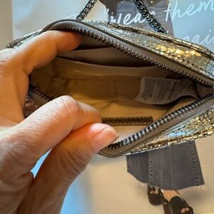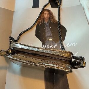 Stylish crossbody bag. Metallic silver finish. Chain strap detail. Perfect for any occasion. Flaws throughout the bag from storage. Super cute for a night out with this chic bag. Inside is like new.