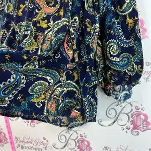 Flowy Anne Klein blouse in a navy paisley pattern. Features coral and teal motifs with golden highlights. V-neckline with gentle gathers. Long sleeves for versatile wear. L. πβοΈπβ¨π©·ππ©΅