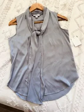 Sleeveless tie-neck blouse by Bar III. Soft, drapey fabric with elegant neck tie. Smooth, lightweight feel. Versatile piece for work or events.