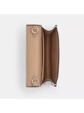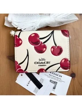 Coach mini leather crossbody with playful cherry print. Polished silver chain strap and embossed Coach logo. Compact and eye-catching for everyday wear.