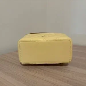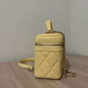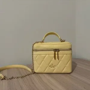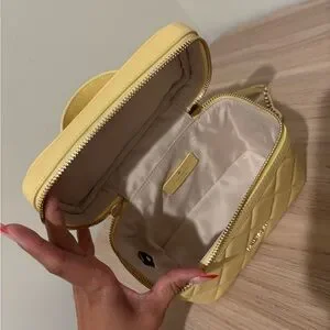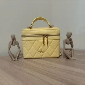 Chic kate spade vanity bag in a soft pale yellow. Made from quilted leather with gold-tone hardware. Features a top handle and zip closure for secure, stylish carry. Perfect for adding a fresh, feminine touch to any outfit.