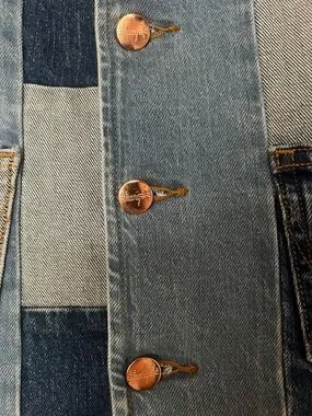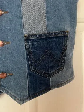 Patchwork denim vest by Wrangler. Button-front closure with metal buttons. Dual front patch pockets. Vertical patch panels create a modern look.