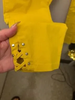 Bold yellow cropped pants by 89th & Madison. Stretchy fabric with a clean waistband. Cropped ankle length with button details at cuffs. Smooth front for a streamlined look. Versatile for casual or dressy outfits.